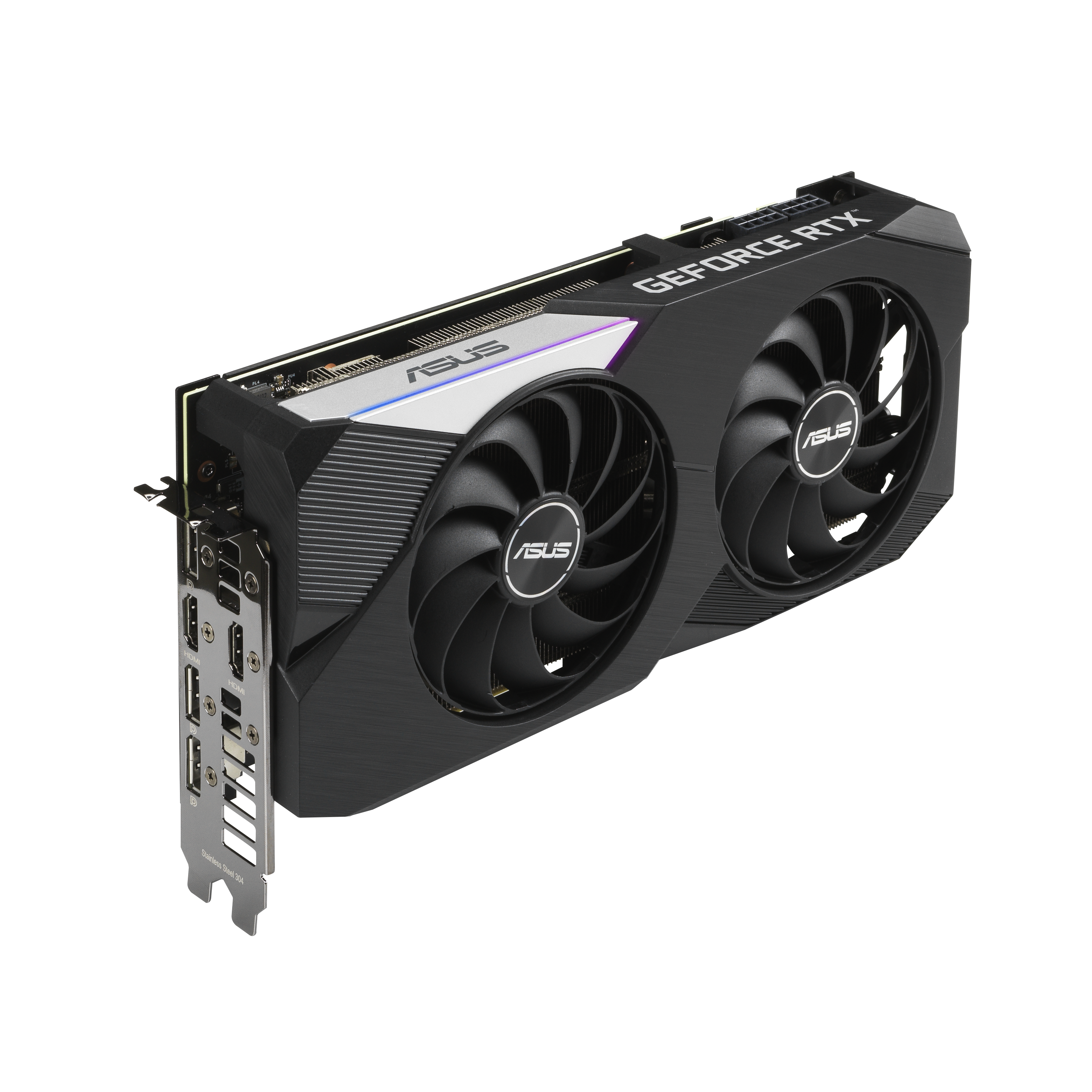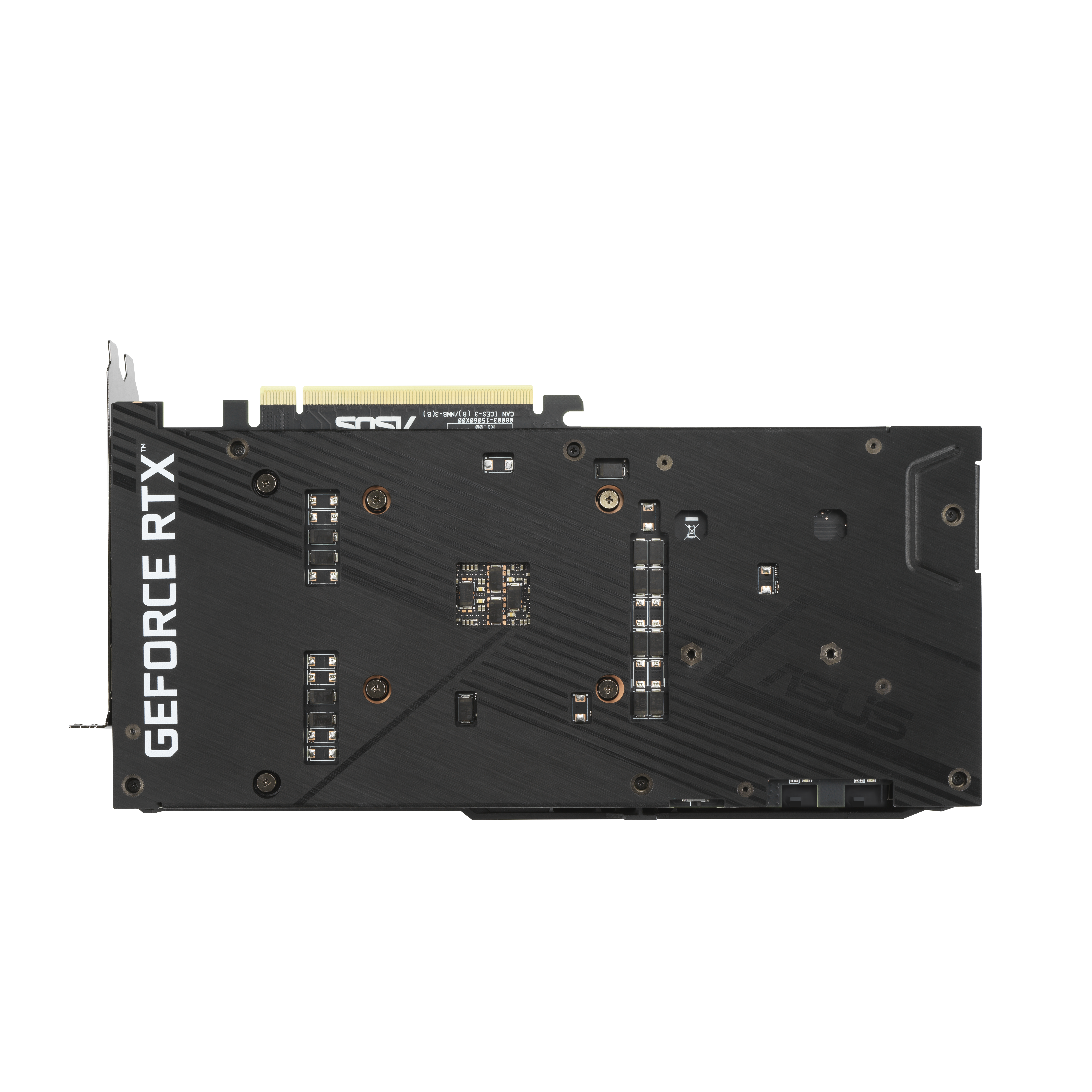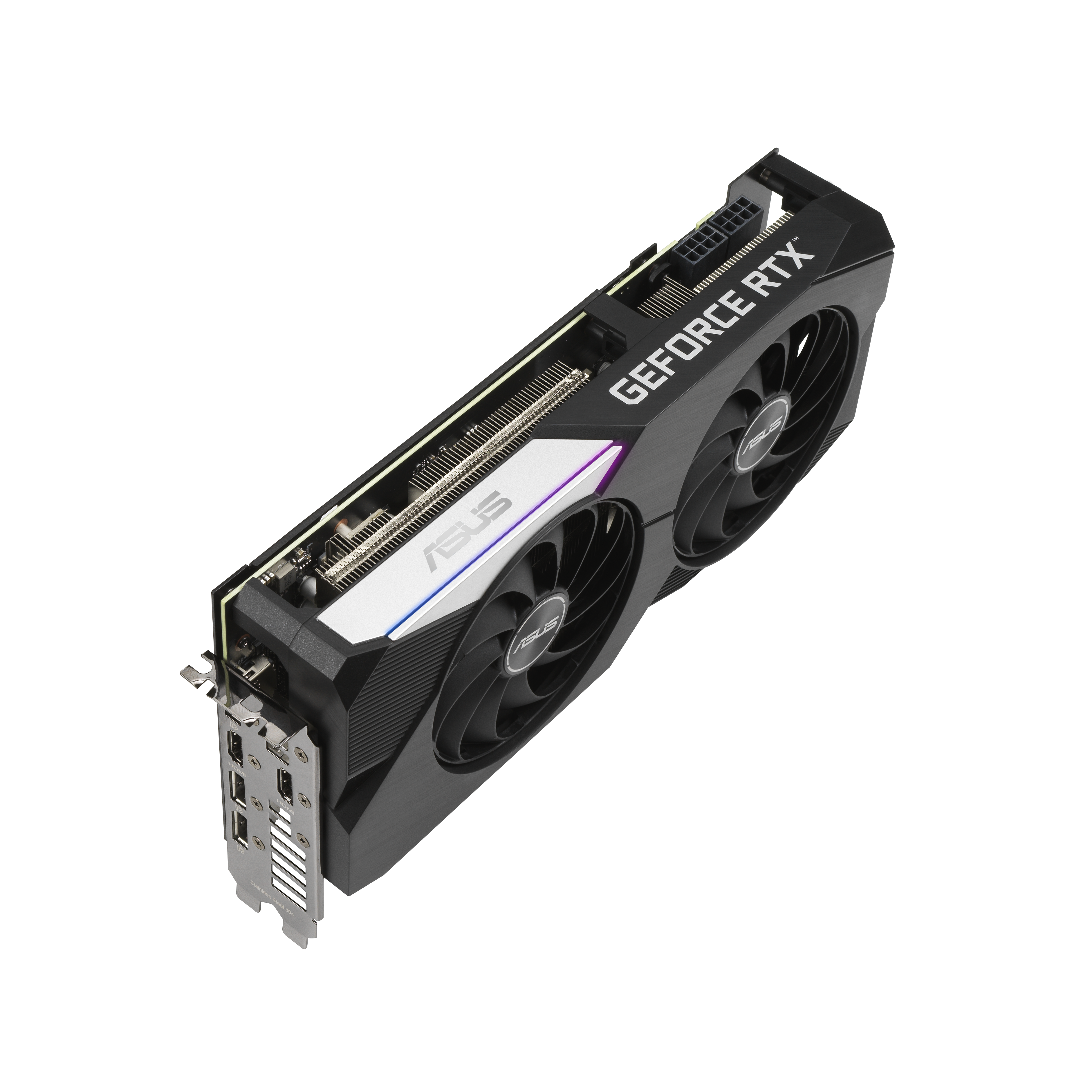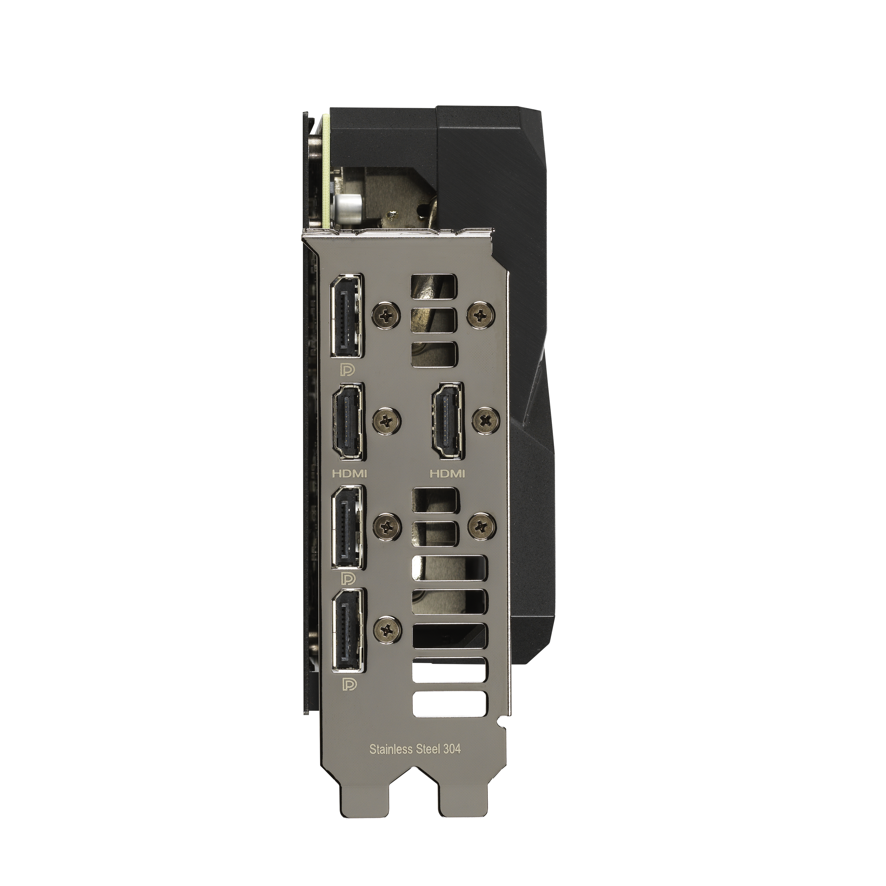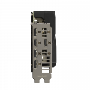 Anche il lato anteriore della GPU è stato migliorato. Un elemento RGB può essere personalizzato attraverso Armoury Crate e il telaio rinforzato della scheda video assicura un’elevata durabilità. Sotto la GPU, una staffa fornisce una pressione di montaggio costante tra la matrice e il dissipatore di calore. L’acciaio inossidabile viene utilizzato per la staffa I / O per proteggere le porte e fornire un montaggio più sicuro.