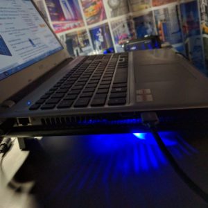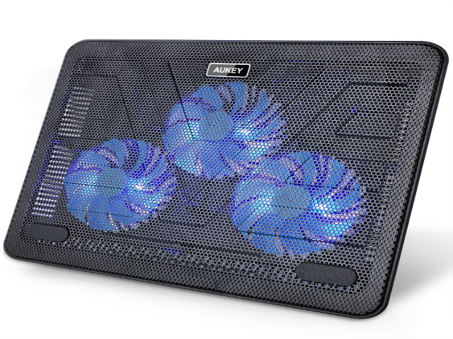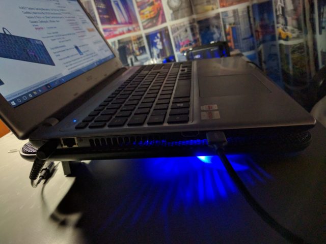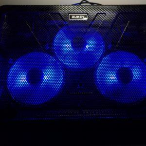 Questa Laptop Cooler (CP-R1) prodotta da Aukey ha veramente un design eccezionale! Innanzitutto abbiamo la parte superiore su cui poggiamo il PC è in metallo con 2 inserti in gomma antiscivolo e con molti fori per consentire all’aria mandata dalle 3 ventole di raggiungere il PC e poterlo raffreddare, le 3 ventole di colore blu sono illuminate da 3 led blu che non si possono accendere oppure spegnere, ma è sempre un piacere vederli accesi, infine nella parte laterale troviamo 2 porte USB 2.0 da cui le ventole prendono l’alimentazione attraverso il cavo già incluso nella confezione e un tasto ON/OFF per spegnere il Laptop Cooler. In queste due settimane ho avuto dei miglioramenti di circa 5 °C che comunque in Estate sono ottimi.